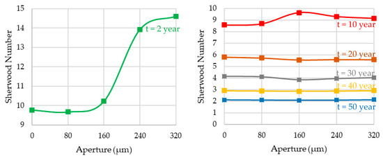 For illustration, Figure 11 shows the average of local Sherwood number beneath the source zone in the top layer at different times versus the aperture size of fracture (Including aperture 2b = 0 which represents homogeneous case or scenario A). As one can see in this figure, at t = 2 years, the Sherwood number increases by enlarging the aperture size. Besides, for the later times (t = 10, 20, 30, 40 and 50 years), the value of Sherwood numbers for the cases of different aperture sizes are almost equal and with increasing the simulation time, the Sherwood number decreases. Therefore, Figure 2 confirms the issue discussed above, and shows that for the early times of the intrusion of fractured Elder problem, the strength of convection and instability is proportional to the aperture size of fracture; however, at the other times, the stability of the system for different aperture size of fractures would be the same.
