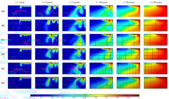 Different scenarios of the fractured Elder problem: (A) homogenous domain, (B–F) orthogonal fracture networks with increasing fracture density.
