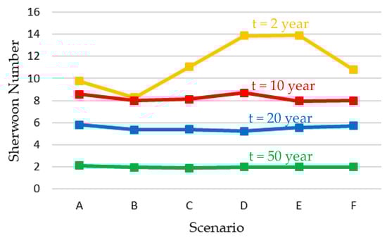 The local Sherwood number beneath the source zone for all the scenarios at 2, 10, 20 and 50 years.