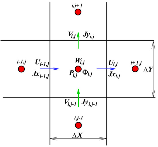The subscript i,j indicates grid location, while the superscripts m and n indicate the iteration of corrections for the convergence of Equation (A3) and the virtual time step, respectively.
