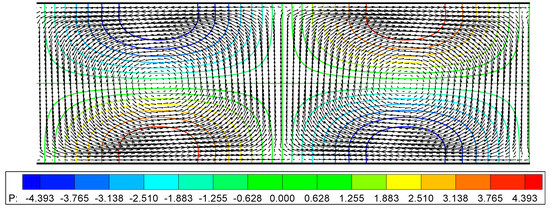 Figure 3 shows the instantaneous profile of the velocity vectors and the pressure at the onset of instability, where the contribution of basic state is excluded from this profile. One wavelength is visualized because this unstable mode of travelling wave has periodicity along the streamwise direction. The color contour lines indicate that the perturbed pressure takes a positive value at the places where the perturbed velocity is positive. This tendency for the pressure can be easily understood by the fact that this perturbed velocity profile is superimposed with the basic flow, and the total flow exhibits a sinusoidal wavy profile. It is noted that the absolute value of the perturbed pressure is not important in the present linear analysis but is shown herein to display the numerical symmetry.
