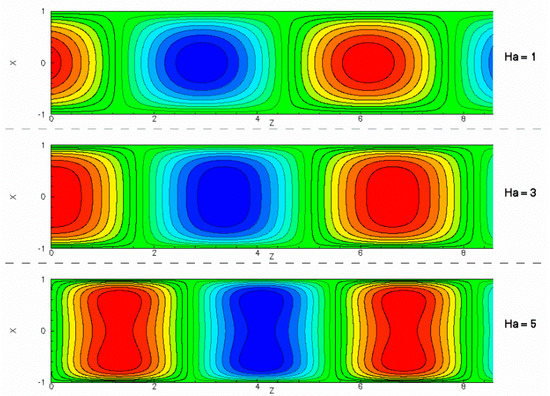 Figure 5 shows the contour lines of the X-directional component of velocity for three cases of the Hartmann number. The red and the blue vortices indicate upward and downward velocity, respectively. As the Hartmann number increases, boundary layers formed in the vicinity of the two walls, which become thinner due to the increase in the critical Reynolds number. The profile of the contour lines is similar to the stream function Ψ because the following equation for is used to visualize the contour maps.