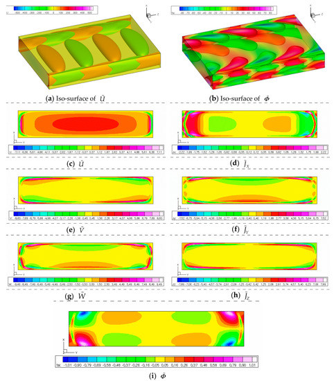 Figure 7 and Figure 8 show perspective views of the iso-surface of vertical velocity and electric potential , respectively, as well as cross-sectional views of the contour map for the three components of velocity, the three components of electric current density, and the electric potential when the uniform magnetic field is applied in either X-direction or Y-direction. Since the strength of the magnetic field is rather weak (Ha = 1), the velocity profiles seem almost similar to each other for both cases. However, the difference in electric current density and electric potential can be found, especially for the contour map of and . This can be explained by considering Ohm’s law, as shown in Equation (26). Since the symmetry mode of is (o,o) irrespective of the magnetic field direction, that of and in the X-directional magnetic field is also (o,o). In a similar way, the symmetry mode of is (e,e) irrespective of the magnetic field direction, and that of and in the Y-directional magnetic field is also (e,e). As shown in Figure 8b, the iso-surface of the electric potential is similar to that of the vertical component of velocity, as was explained using Equation (34), because the distribution of electric potential is quite similar to that of stream function when the magnetic field is applied in the direction parallel to the axis of vortices.