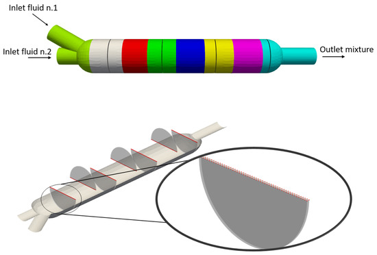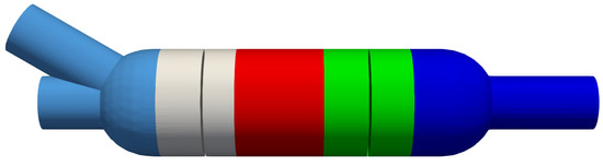 To further investigate how different geometric characteristics impact the performance of the mixing device, the length of the mixer is reduced together with the number of the baffles. The goal is to measure and compare (with the previous scenarios) the performance of the reduced length tube when using the “coupled” approach (Scenario 3). The purpose of choosing the “coupled” approach is because it has been shown that is offers the most wide-spread non-dominated front compared to other approaches. In detail, the length of the new tube is and the number there are only four baffles. The diameter of the mixer and the characteristics of the two fluids remain the same. The longitudinal positions of the baffles are given in Table 2. Figure 12 presents the mixer geometry coloured by the mesh regions that each baffle belongs to.