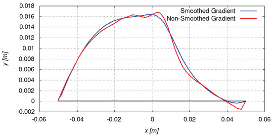 The profile of the top surface of the first baffle at the end of the first optimization cycle (with the NBP) when a non-smoothed (red) or a smoothed (blue) gradient is used. Note that the diameter of the inner cylindrical surface of the tube is 0.1 m.