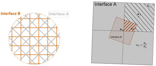 During the solution, consecutive mesh blocks are communicating by interpolating each discrete field , p, a over their non-matching interfaces (in the PAP). The same holds also for the adjoint fields , q and . The interpolation is done between two interfaces A and B that are geometrically identical, but with different distribution of nodal positions (Figure 3). To do this, for each face over the interface A, all the faces belonging to B which it overlaps with are tracked down. For each , the relative weight contribution is calculated as , where S is the surface area of each face. This way, the interpolated value of a variable from interface B to A becomes as with K being the total number of overlapping faces.