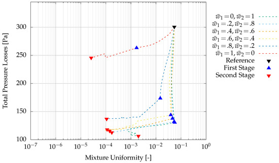 In this section, all plots presenting the computed optimal solutions use the objective functions (Equation (5)) and (Equation (6)) divided by the (fixed) volume flow rate; no special symbols for the so-modified functions are used.