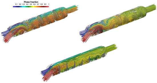 Scenario 1. Velocity streamlines coloured by the phase fraction for the reference geometry (top-left), the optimized geometry with (top-right), and that with (bottom).