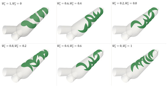 The geometries of the non-dominated solutions are shown in Figure 6. Also, Figure 7 demonstrates the phase fraction over the outlet plane for each value-set of weights for all the non-dominated solutions. It is noticeable that, for high values, the NBP tries to remove material from the baffles in order to avoid increasing the total pressure losses caused as a consequence of intensive flow recirculation. This, of course, has a negative impact on the mixing of the two fluids. In addition, in the extreme case where and , the PAP turns all the baffles towards the same side of the mixer and makes “space” for the fluid to flow with the least resistance to its motion. On the other hand, when higher weighting values are associated with , the profile of the baffles acquires a “wavy” shape which improves the mixing performance. In addition, by optimizing the angular positions of the baffles, these are placed so as to redirect the vorticity vector of the recirculation causing increased flow mixing. The way the flow develops in the devices corresponding to the two extreme points of the front (the ones with either or ) is presented in Figure 5.