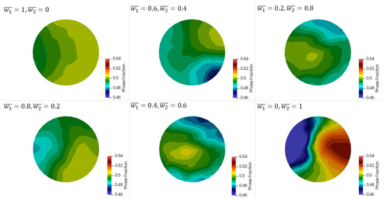 Scenario 1. Final distribution of the phase fraction at the outlet for each set of weights.