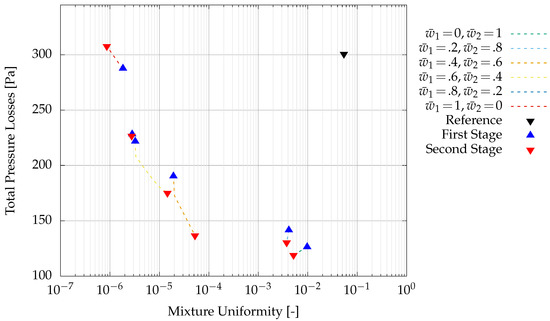 where is the unit outward normal vector to the outlet boundary. The term into parenthesis in the integral denotes the deviation of the local from its averaged value over the outlet patch. In a well-mixed flow, tends to zero. The second objective function is related to the (volume flowrate-weighted) total pressure losses occurring between the inlets and the outlet. This is given by