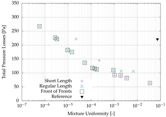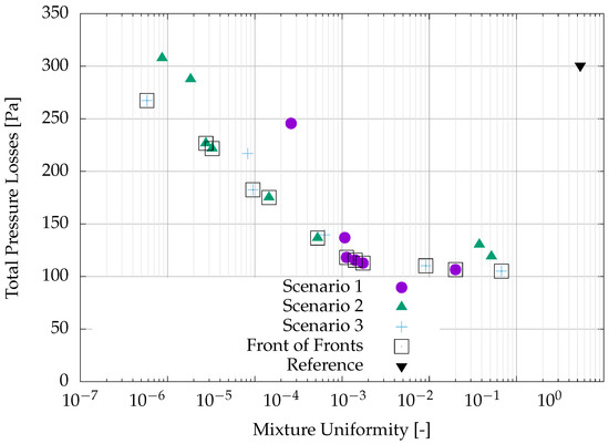 Reduced Length Mixer. Fronts of non-dominated solutions for the reduced length mixer, using Scenario 3. The final front of non-dominated solutions (“Front of Fronts”) from all optimizations is demonstrated (empty squares).