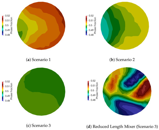 Running six optimization problems using the “coupled” approach (as in Scenario 3) with the same value-sets of weights, the non-dominated front of optimal solution is computed and depicted in Figure 13 together with the objective values of the reference (reduced length) geometry. In the same graph, the non-dominated front of the regular tube geometry is included too. It can be seen that the optimal solutions of the reduced length mixer are dominating in the low region extending the range of the front of non-dominated solutions towards this area. Finally, Figure 14 demonstrates the phase fraction distribution at the outlet patch of the mixer for the three different optimization scenarios and for the reduced length mixer (computed with Scenario 3). The demonstrated results concern optimizations done targeting only the . As it can be seen in Figure 14, Scenario 3 delivers an almost perfectly homogeneous mixture, whereas the reduced length mixer has noticeable differences from all the regular length scenarios.