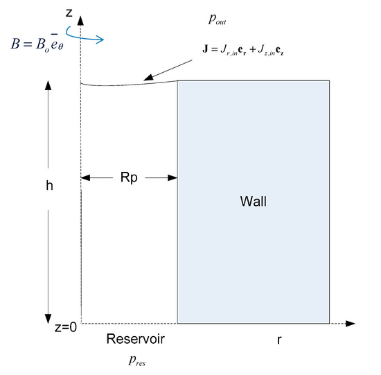 where Jtot denotes the dimensionless total electric current entering the pore at its interface with the surrounding medium, calculated via its known radial and axial distribution at the pore interface coupled with the conservation of the electric current. This value is also used to fix the transformed pressure at the interface with the reservoir. The rest of the boundary conditions in Equations (17) and (18) reflect the assumption of electrically insulated pore walls, symmetry of the electric current at the axis of symmetry r = 0, and fully developed electric current distribution at the pore entrance. Finally, it should be pointed out that the azimuthal component of the magnetic field employed in the present study does not satisfy the condition of irrotationality, and consequently, care should be taken to avoid the introduction of spurious electric currents via application of Ampere’s law. However, this issue is circumvented, for the low magnetic Reynolds number situation examined in the present study, by the introduction of the stream function, H [23,24] that allows for the component of the Lorentz force that tends to push liquid metal out of the pore region to be captured, depending on the relative direction of the magnetic field and electric current, in a consistent manner.