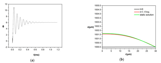 In order to validate the numerical method and the developed code, we performed several benchmark tests. As a first test, we considered a single pore with a height of 1 mm and radius of 30 μm filled with liquid lithium (, , , ) in a static configuration, with no pressure drop imposed between the reservoir and the plasma phase above the interface [20]. The pore is subject to an external magnetic field of intensity, , that is applied along the azimuthal direction. At time t = 0, an electric current with constant radial and axial components, (), enters the pore through its interface, resulting in a Lorentz force that pushes the liquid out of the pore and causing an upward motion. In this manner, we simulated an electric current, e.g., eddy current, that enters the porous structure due to a sudden event in the bulk of the surrounding plasma. The gravitational Bond number is equal to Bond = 1.13 × 10−5, whereas the Reynolds number is Re = 195.95. Figure 3 depicts the temporal evolution of the angle, θ, at which the interface meets the pore edge, and it is obvious that after the liquid is pushed out, a competing force due to the capillarity acts in the opposite direction, pushing the liquid back into the pore in an effort to restore the original configuration. This interplay between the two forces results in a periodic motion, as shown in Figure 3a, with a decaying amplitude until the fluid settles to a static steady flow arrangement corresponding to the imposed disturbance, as shown in Figure 3b. It should be stressed that the presence of the rotational part of the Lorentz force does not allow for the fully static arrangement to be recovered. However, for small enough values of Bondm, the rotational part of the fluid motion is vanishingly small, and consequently, the liquid metal inside the pore is nearly at rest while the shape of the interface is almost indistinguishable of the one obtained by a static calculation of the interaction between the liquid metal and the Lorentz force ignoring the rotational part. Thus, the shape of the interface essentially reflects the effect of magnetic pressure on the static arrangement, assuming a fixed contact point at the pore edge in the manner predicted in [20].