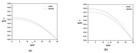 Maintaining the same conditions as those described in Section 2.2.3 that presents the benchmark tests, we proceeded to investigate the dynamic response as the incoming electric current was further increased, i.e., increasing Bondm. A flat distribution of Jr(r) = Jr,in was employed here as well for the purpose of comparison with previous results. The simulations indicate that there is a critical value for the Bondm (Bondm,cr1 ≈ 4.5, Jr,in,,cr1 ≈ 5 × 108 A/m2) below which the flow very quickly reaches a steady state, as shown in Figure 5. The final steady interfacial shape does not differ significantly from the corresponding static solution, but it is clear that as Bondm increases, the difference between the two solutions tends to increase (Figure 6). This is due to the fact that the rotational part of the Lorentz force, which is expressed by the term in Equation (7), is gradually intensified at steady state with increasing Bondm, as manifested by the rotational steady patterns formed in the area below the interface, exhibited by the streamlines shown in panels a,b of Figure 7. By inspecting the distribution of the electric stream function, H, at the steady state (Figure 7c,d), it is evident that the non-zero values are limited in the area below the interface where the steady patterns are observed and, moreover, it is understandable that even though the absolute value of H does not increase significantly in this range of Bondm, the rotational part of the Lorentz force is gradually intensified.