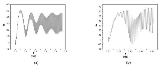 Next, we examined the effect of increasing the electric conductivity, λ, of the liquid metal on the dynamic response of the liquid–plasma interface, especially in terms of stable operation. In order to isolate its effect, we considered the physical properties of liquid lithium (Li) presented in Section 2.2.3 and we only increased the electric conductivity of the liquid metal, setting it to . As illustrated from Figure 14, the increased electric conductivity results in the stabilization of the interface, whereby the amplitude of oscillations is mitigated and drop formation is avoided, contrary to the case of the electric conductivity of Li, also shown in Figure 14. In order to assess the stabilizing role of the electric conductivity, we carefully examined the governing equations. Clearly, the influence of the electric conductivity is practically incorporated in the parameter c that arises in Equation (14). It measures the relative strength of the induced electric current, as a result of the interaction between the magnetic field and the moving liquid metal, and the electric current that enters the pore from the surrounding medium. An increase in this parameter results in a stronger induced electric current inside the pore as is clear from Equations (14) and (15). As a consequence, the primary Lorentz force that tends to destabilize the interface by pushing the liquid outside the pore, generated due to the interaction between the external electric current and the magnetic field, is counteracted by the Hartmann braking effect due to the induced electric current and the flow exhibits a more stable behavior.