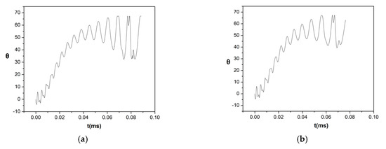 Temporal evolution of the angle, θ, at which the interface meets the pore mouth for Li and Ga and for the external electrical current Jr,in equal to (a) 6.5 × 108 A/m2 and (b) 8 × 108 A/m2.