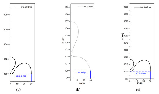 with and denoting the normal velocity of the liquid at the interface and of the interface, respectively, the unit normal vector at the interface pointing outwards with respect to the liquid metal, and is the Lagrangian representation of the interface. Furthermore, we adopted a fixed contact point approach [19,20] for the shape of the interface as it approaches the pore–substrate interface at the top, and the boundary conditions corresponding to the liquid metal velocity and the location of the interface at the pore wall are: