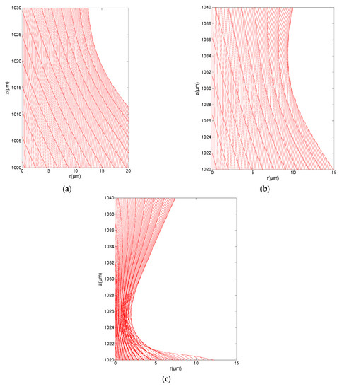 Evolution of the grid as the finite time singularity is developed for Bondm = 6.3: (a) t = 0.0715 ms, (b) t = 0.0732 ms, and (c) t = 0.0758 ms.