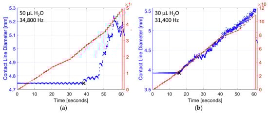 Examples of raw droplet spreading data collected while vibrating droplets of deionized water with a ramped sine wave signal increasing in amplitude (5 V/s) from zero to 300 V: (a) a 50 µL droplet vibrated at 34.8 kHz, and (b) a 30 µL droplet vibrated at 31.4 kHz. The diameter of each individual droplet begins to increase once acceleration levels are sufficiently high. The initiation of droplet spreading is calculated using a post-processing algorithm and is noted as a black ‘x’ in each example. In most cases the droplet diameter increases linearly with the acceleration response, but stick-slick contact line motion can also occur as observed in (a) after the initiation of droplet spreading.