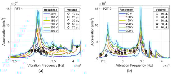 The frequency response (colored lines) of PZT 1 (a), and PZT 2 (b) at varying driving amplitudes, and the acceleration at which ultrasonic spreading was initiated (black markers) for deionized water droplets.
