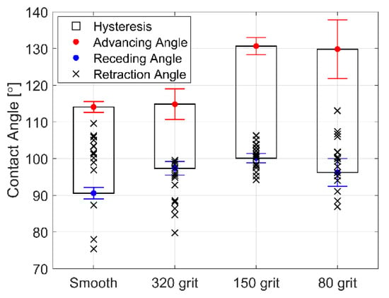 Ra Contact angle (CA) hysteresis, as well as advancing and receding CAs for deionized water on smooth and roughened surfaces coated with FluoroSyl. The final CAs of spread droplets after vibration (retraction angle) are plotted as an “x”.