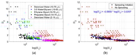 plotted against . (a) Data plotted as dots represent variable conditions at the initiation of droplet spreading for each corresponding liquid, while the data plotted as an “x” represent variable conditions when droplets for each corresponding liquid did not spread. (b) The same data as (a), but without differentiating between liquid. A black dot represents the point where spreading initiated, a red “x” are conditions without spreading. A linear regression of the log-log data for the condition where droplets begin to spread is shown in blue with the equation noted in (b).