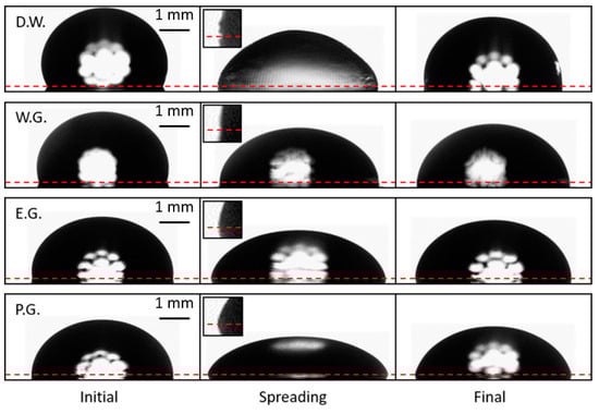 Ultrasonic spreading of deionized water (D.W.), 3:5 water/glycerol (W.G.), ethylene glycol (E.G.), and propylene glycol (P.G.) droplets. Droplets were not vibrated in the initial or final state. The horizontal dashed line is plotted through the triple point at each side of the droplet. The inset images magnify the triple point to clarify the CA oscillations produced by the surface waves if they are resolvable. Small capillary waves were observed on the surface of all liquids tested, however they are most apparent on the surface of deionized water droplets (inset, top row).
