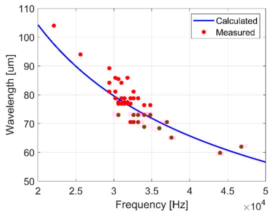 In addition to frequency, the wavelength of surface waves was approximately measured from images for 10–70 µL droplets of deionized water vibrated at frequencies between 20 and 50 kHz. The measurements were found to agree on average within 3.5% of the well-known dispersion relation for 1-D capillary waves on a flat liquid surface (Figure 9) []: