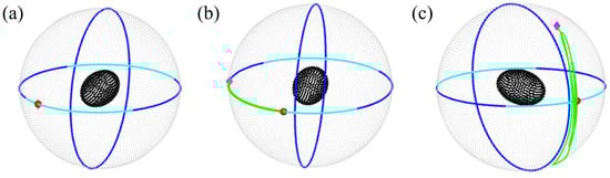 written in terms of submatrices , , and . The linear and angular velocities are related to force and torque by and , respectively, while the linear velocity is related to the torque and vice versa by and its transpose. The explicit forms of the submatrices used for our example swimmer in Section 3.4 are calculated using the method of regularized Stokeslets [40,41], as detailed in the next subsection.