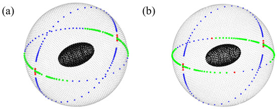 Figure 3b,c shows directions of relative to the swimmer head for these two field magnitudes. The direction can lie anywhere on the light gray sphere around the ellipsoidal head; the tail of the swimmer (not shown) points downwards. The red and green lines are all directions of , which are steady corotating solutions; i.e., directions of which satisfy Equation (9). The blue region shows possible stable solutions; i.e., directions of for which the real parts of eigenvalues of the matrix in Equation (25) are negative. These stable directions are found by determining the magnetization vector corresponding with each direction and computing the eigenvalues of for that pair of and vectors. The (un)stable solutions are highlighted with (red) green in the figure. Note that, although parts of the red curve may seem to be lying inside the blue region, there is a very narrow space visible separating the two halves of each blue region and hence only the part highlighted by green is actually stable.