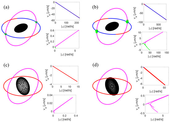 Steady solutions as identified by their magnetic field directions in the body frame of the swimmer. The tail of the swimmer (not shown) points downwards. The solutions are identified as blue: stable and propulsive; red: unstable and propulsive; green: stable and tumbling; and magenta: unstable and tumbling. Insets show the average swimming velocity () [32,42] as a function of frequency for the steady solutions, using the same colors. (a) Prolate ellipsoid with four turn tail. (b) Prolate ellipsoid with one turn tail. (c) Oblate ellipsoid with four turn tail. (d) Oblate ellipsoid with one turn tail. Shorter tails have tumbling solutions for a wider range of rotation frequencies. Prolate ellipsoidal heads result in stable propulsive and tumbling solutions, while oblate ellipsoidal heads only have stable propulsive solutions very close to zero rotation frequency.