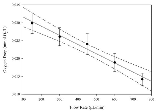 The average oxygen uptake rate on a per-cell basis is shown in Figure 5 as compared with the residence times experienced at the associated flow rate. A linear regression was performed. Dashed lines in the figure show the 95% confidence interval for the linear regression analysis, and error bars represent mean ± SEM. A sample size of n = 8 was used for analysis for the OUR cell. A sample size of n = 3 was used for the analysis of residence time.