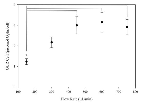 In Figure 3, the average oxygen uptake rate on a per-cell basis is shown in comparison to the flow rates tested. As flow rate increased, a linear increase in average oxygen uptake rate on a per-cell basis was observed. Error bars in the figure represent mean ± SEM. A sample size of n = 8 was used for analysis. ANOVA with a post-hoc Tukey’s test was completed to calculate significance “*” (p < 0.05).