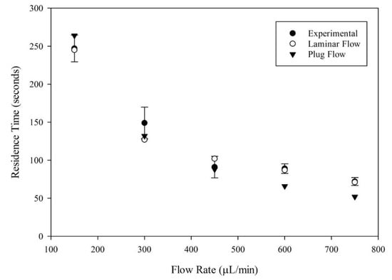 Theoretical values for residence time were computed for laminar tubular reactors and plug flow reactors, then compared with experimental values. Error bars in Figure 4 represent mean ± SEM. A sample size of n = 3 was used for analysis.