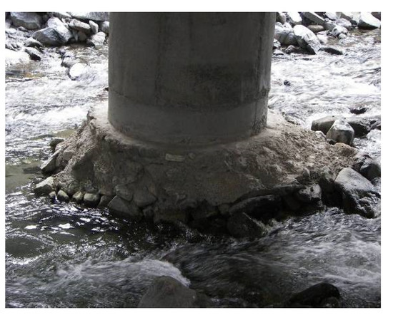 In the past two decades, many highways have been constructed in China, especially in the western mountainous areas. To minimize the effects of highway infrastructures on the local environment and biological systems, longitudinal bridges are more frequently adopted. Unlike the conventional bridges that are cross over the river, the longitudinal bridges are built in the river and extended along the river. This eliminates building embankment and tunnels that cause significant effects on the local environment. For example, the Xi’an-Hanzhong highway of China contained nearly 10 km of longitudinal bridges as shown in Figure 1. However, tandem piers of longitudinal bridges are distributed in the riverbed, which significantly disturbs river flow fields and causes soil erosion and scour. For example, half a year after the Xi’an-Hanzhong highway was opened to the public on September 2007, many longitudinal bridges of the Xi’an-Hanzhong highway have found severe scour issues as shown in Figure 2, which affected the foundation safety of bridges.