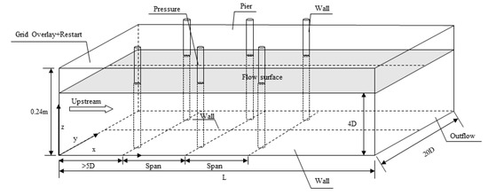 According to the research results of Sarker [40], in order to reduce the influence of parameters such as calculation domain size and water depth on the calculation results, the distance between the inlet and the first pier must be longer than 5D. The length of the domain in the flow direction (L as shown in Figure 5) varies with the span of the piers. This ensures that there are at least four piers in the model. The layout and the boundary conditions of the model with piers are shown in Figure 5.