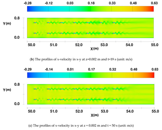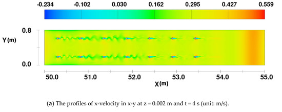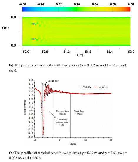 Figure 6a shows the x-velocity in the x-y plane at z = 0.002 m and t = 50 s. The Kármán vortex street is formed when the water flows around the pier, which causes the velocity to change rapidly within a certain length after the pier. As the water flows away from the pier, the influence of the vortex on the velocity reduces and water eventually becomes stable. Figure 6b shows the x-velocity at y = 0.19 m and y = 0.61 m, z = 0.002 m, and t = 50 s. The area affected by the Kármán Vortex Street start from x = 50.3 m to x = 50.74 m, with a length of 0.44 m (11D), followed by a recovery area (or stabilization area) from x = 50.74 m to x = 51.40 m with a length of 0.7 m (16.5D), followed by a stable area after x = 51.40 m (longer than 27.5D).