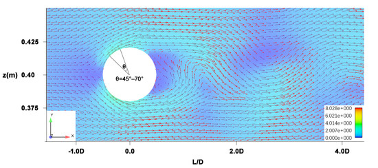 Figure 7a,b show the zoomed flow field around the pier. We can observe the following characteristics: the horseshoe vortex in front of the pier, the bottom boundary layer, the lateral velocity field, a flow separation on both sides of the pier, and a wake vortex behind the pier. In Figure 7b, the flow separates at about 95° on both sides from the pier, and a weak vortex is formed within 1D behind the pier. Figure 8 shows the excess shear stress field on the river bed surface. It shows the maximum excess shear stress occurs at around 45°–70° (the angle is measured from the main flow direction, as shown in the sector) on the pier side. Referring to the results of Roulund et al. [43], the position of the maximum excess shear stress is where the erosion begins.