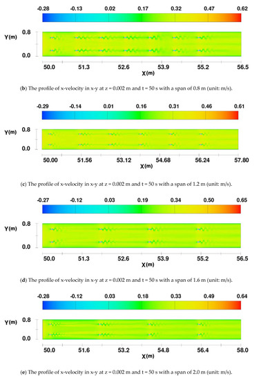The spans between piers were increased from 0.52 m to 0.64 m, 0.80 m, 1.20 m, 1.60 m, and 2.00 m. The simulations were repeated for each span. Profiles of the x-velocity with different spans in x-y at z = 0.002 m and t = 50 s are shown in Figure 10.