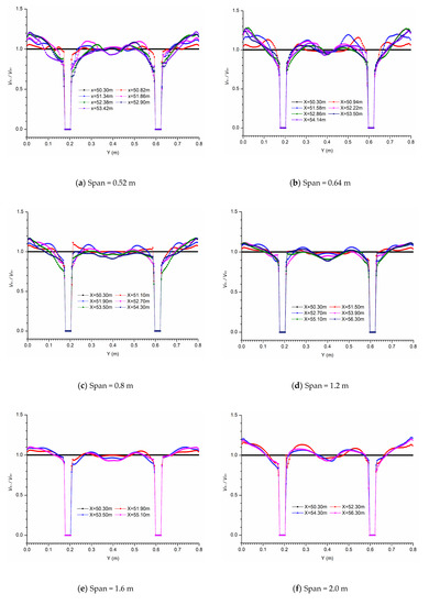 In order to obtain the characteristics of the x-velocity fields as a function of the span of piers, cross-sections at the center of each row in the x direction were selected and normalized with the velocity at the first cross-sections of each row in the different models. The normalization can show the difference of velocity affected by different spans between cross-sections. The profiles of VRi/VR1 (VRi is the x-velocity of the i-th cross-section, and VR1 is the x-velocity of the first cross-section) are plotted in Figure 11.