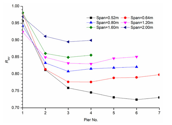 - The RMV of the piers in the first row of different models is around 0.95, and then reduces sharply to the second pier in each model, which is around 0.82 when the span is shorter than 27.5D and up to 0.91 if the span is longer than 27.5D. If the span is longer than 27.5D, the RMV is close to each other from the 2nd pier to the last one.