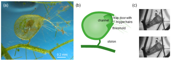 Trap of aquatic bladderwort Utricularia sp. of the vulgaris trap type [32]. (a) Lateral view of a single vulgaris-type trap; the trap contains a prey item (ostracod). (b) Sketch of a vulgaris-type trap; the trap mouth is surrounded by long bristles (light green) and is closed off by a dome-shaped trap door (dark green line) with trigger hairs (fine dark green lines); as the door opens inward (dotted green line), it forms a channel between the door and the threshold. (c) Frontal view of a vulgaris-type trap, before (top panel: loaded trap) and after triggering (bottom panel: unloaded trap).