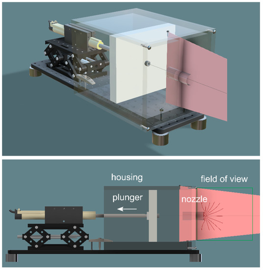 Sketch (perspective and elevation) of the mechanical suction-feeder model, showing the plunger (grey plate, area 191 mm × 191 mm) within its housing (transparent box) mounted onto a breadboard (black base); the actuator is mounted on a laboratory jack and withdraws the plunger to create a suction flow into the nozzle (cylinder mounted into the face plate of the housing); a laser sheet (red) illuminates the flow near the nozzle. The mechanical model is submerged in a 200 L tank containing mineral oil.