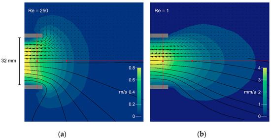 Flow fields generated by the mechanical model at Re = 250 (a) and Re = 1 (b). Magnitudes are represented by color contours; flow direction is indicated by vectors and streamlines in black. Grey bars show the nozzle in cross section (inner diameter 32 mm). The axial and radial transects are illustrated in red, and the corresponding vector magnitudes are plotted in Figure 5a–c below).