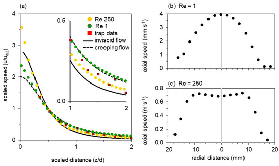 In the bladderwort-relevant parameter space, the qualitative shape of radial transects near the mouth is diagnostic of the intermediate flow regime (Figure 4 and Figure 5) [49,50,52,67]. Reynolds number calculated in the mouth plane, or at half-gape range, also remains a primary quantitative measure. At greater distance the velocity fields are qualitatively similar—both resembling flow to a distant sink (Figure 4)—although, with sufficient sensitivity, the flow regime can be evaluated by the absolute value of a suitably scaled axial speed (Figure 5a). At Re 250 the contours of constant speed are axially flattened in comparison to Re 1, and their gradient is steeper. Streamlines in this more-inviscid case show that relatively more fluid is drawn from the radial direction. Finally, for comparison with Re 1, the velocity field of creeping flow through a circular orifice (“Sampson flow”) is illustrated in Appendix B. The contours are less forward-directed than the experimental Re 1 field in Figure 4, despite the excellent overlap of the axial transects. Non-zero tube length is known to extend the field axially near the aperture [57], but instrumental factors may also be at play. Because the Re 1 velocity field represents a measurement lasting several minutes, it shows a spurious vertical component introduced by background convection driven by temperature or bubble buoyancy. Distortions will also be caused by return flow from the back of the plunger, since the tank volume is finite.
