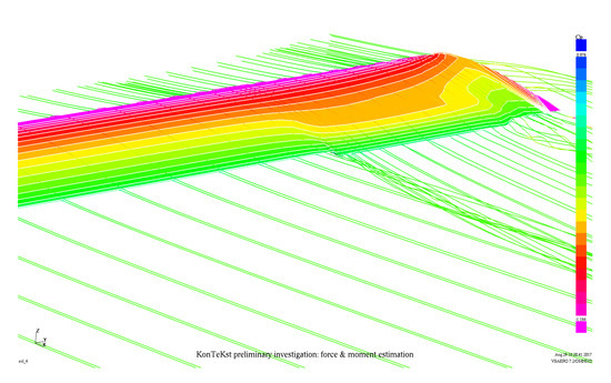 In order to estimate the capabilities of a regular camber changing trailing edge flap on the three-dimensional (3D) wing, a VSAERO model was generated. VSAERO is a potential flow panel software package for aerodynamic analysis of arbitrary shaped bodies, [36]. To this end, XFOIL was used to generate airfoil coordinates for a flap featuring 20% relative flap depth and a deflection of 10° (positive downward), with the hinge line being placed on the symmetry line of the airfoil. Simulating a single flap ranging from y = 1.2 to 1.5 m, the un-flapped airfoil coordinates were used from 0.0 to 1.19 m, and again from 1.51 m up to the tip at 1.6 m, thus, providing a transition zone from un-flapped to the flapped airfoil of 1.0 cm on both sides of the flap. As shown in Figure 4, the flap region is depicted which includes representation of off-body streamlines and pressure contours on the surface, for a representative angle of attack of 6.0°.