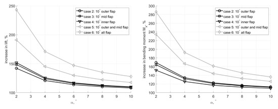 Relative increase of lift and root bending moment for various angles of attack (independent of flight velocity), and various flap deflection cases.