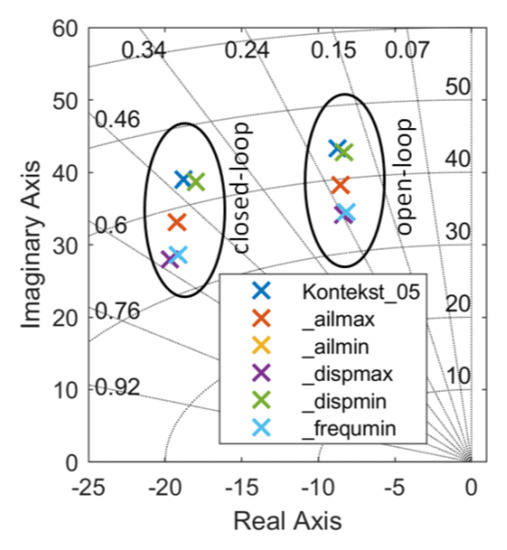 Comparison of open- and closed-loop poles of the first wing bending mode of the different aeroelastic models.